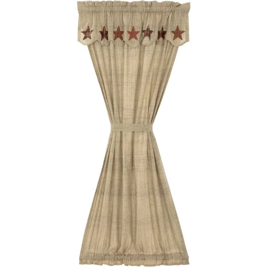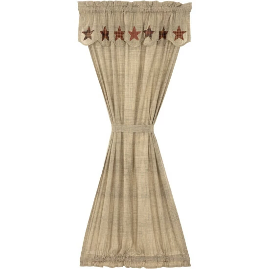 - APPLIQUE STAR: Attached valance contains appliqued 5-point stars with frayed edges in assorted burgundy plaids
