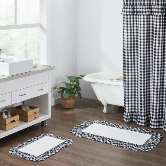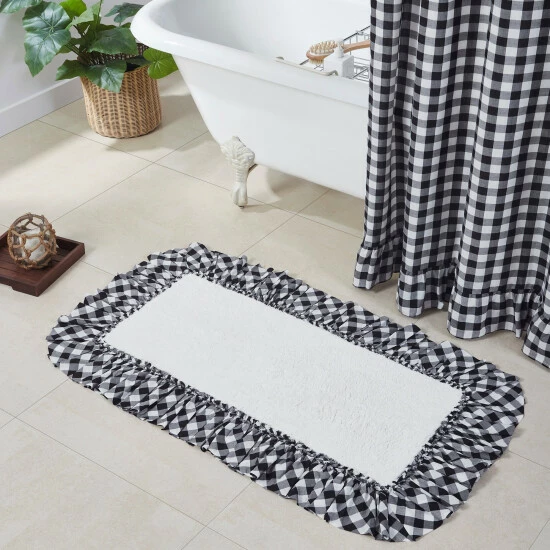 Add a farmhouse touch to your bath or living space with the Annie Buffalo Black Check Bath Mat. This comfortable 27×48 mat showcases beautiful concentric hues of black and soft white. With a ruffled edge, ruched ruffle, and tufted weave, this check bath mat will find a place in your home for years to come. Reverses to a solid tan rubber underside to prevent slippage.