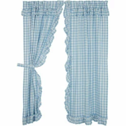 Brighten up your windows with cozy elegance and vintage charm. Our Annie Buffalo Blue Check Ruffled Panel Set of 2 84×40 features classic buffalo check in calming colors of dusk blue and soft white, gracefully trimmed with ruffles. Finished with a white cotton lining to help filter light and includes two matching tie-backs for a quick style change.