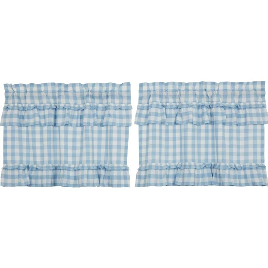 Brighten up your windows with cozy elegance and vintage charm. Our Annie Buffalo Blue Check Ruffled Tier Set of 2 24Lx36W features classic buffalo check in calming colors of dusk blue and soft white, gracefully trimmed with ruffles. Finished with a white cotton lining to help filter light.