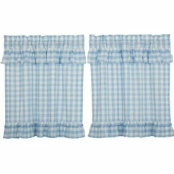 Brighten up your windows with cozy elegance and vintage charm. Our Annie Buffalo Blue Check Ruffled Tier Set of 2 36Lx36W features classic buffalo check in calming colors of dusk blue and soft white, gracefully trimmed with ruffles. Finished with a white cotton lining to help filter light.