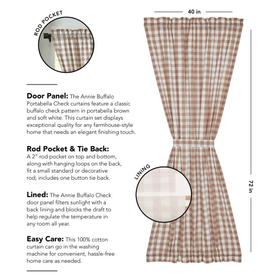 Dress up any door in your cozy cottage with a soothing southern twist. Our Annie Portabella Buffalo Check Door Panel 72×40 features a classic buffalo check pattern in portabella brown and soft white. Crafted in 100% cotton and finished with a standard .5 inch hem fold on each side, this buffalo check door panel displays exceptional quality for any farmhouse-style home that needs an elegant finishing touch. This fashionable curtain includes 1 matching tieback with a button to wrap around the center for a different look and two rod pockets for easy hanging.