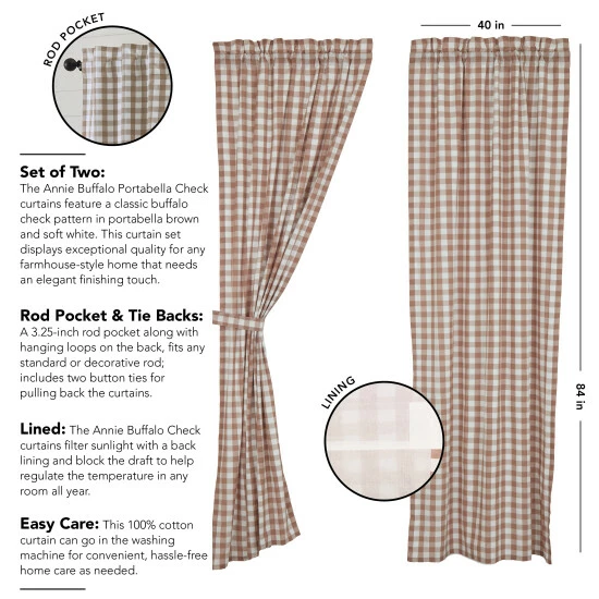 Dress up any window in your cozy cottage with a soothing southern twist. Our Annie Buffalo Portabella Check Panel Set 84×40 features a classic buffalo check pattern in portabella brown and soft white. Crafted in 100% cotton, this buffalo check curtain set displays exceptional quality for any farmhouse-style home that needs an elegant finishing touch. Includes matching tiebacks to change up the look and let in natural light.