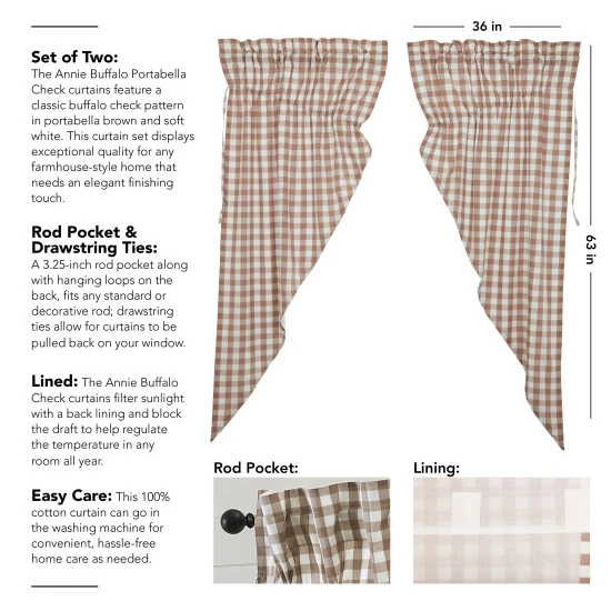 Dress up any window in your cozy cottage with a soothing southern twist. Our Annie Buffalo Portabella Check Prairie Short Panel Set 63x36x18 features a classic buffalo check pattern in portabella brown and soft white. Crafted in 100% cotton, this buffalo check curtain set displays exceptional quality for any farmhouse-style home that needs an elegant finishing touch. Includes drawstring ties to change up the look and let in natural light.