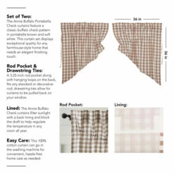 Dress up any window in your cozy cottage with a soothing southern twist. Our Annie Buffalo Portabella Check Prairie Swag Set 36x36x18 features a classic buffalo check pattern in portabella brown and soft white. Crafted in 100% cotton, this buffalo check curtain set displays exceptional quality for any farmhouse-style home that needs an elegant finishing touch. Includes drawstring ties to change up the look and let in natural light.