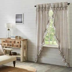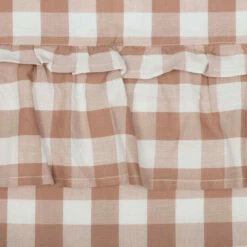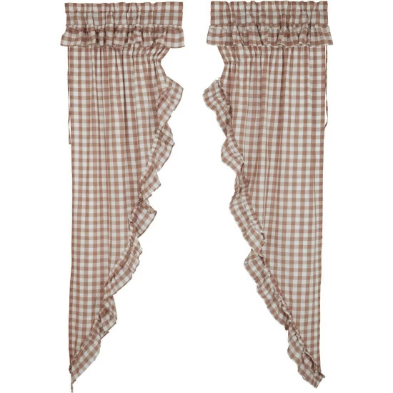 Brighten up your windows with cozy elegance and vintage charm. Our Annie Buffalo Portabella Check Ruffled Prairie Panel Set of 2 84x36x18 features classic buffalo check in calming colors of portabella brown and soft white, gracefully trimmed with ruffles. Finished with a white cotton lining to help filter light and includes drawstring ties for a quick style change.