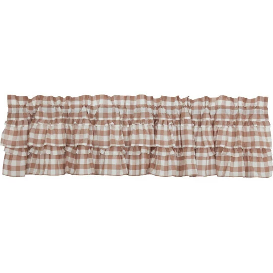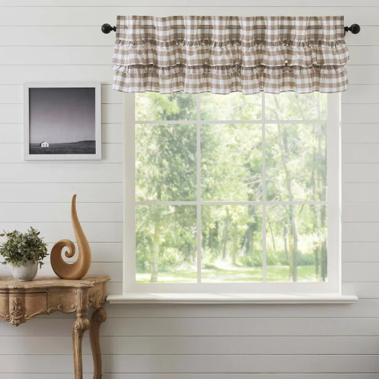 Brighten up your windows with cozy elegance and vintage charm. Our Annie Buffalo Portabella Check Ruffled Valance 16×72 features classic buffalo check in calming colors of portabella brown and soft white, gracefully trimmed with ruffles. Finished with a white cotton lining to help filter light.