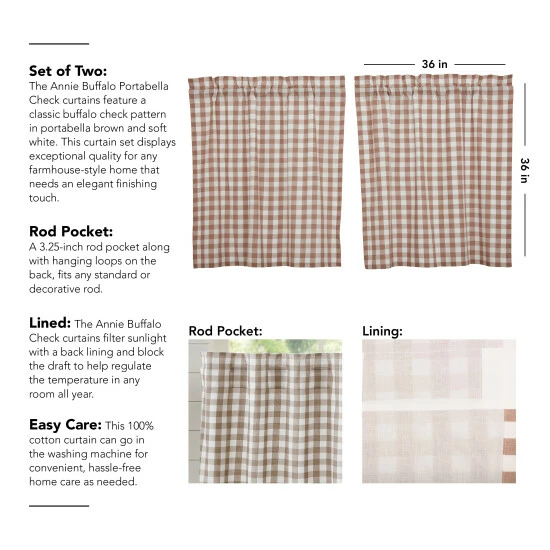 Dress up any window in your cozy cottage with a soothing southern twist. Our Annie Buffalo Portabella Check Tier Set 36Lx36W features a classic buffalo check pattern in portabella brown and soft white. Crafted in 100% cotton, this buffalo check curtain set displays exceptional quality for any farmhouse-style home that needs an elegant finishing touch.