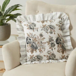 Decorate your home in vintage farmhouse elegance with the Annie Portabella Floral Fabric Pillow 18×18. Beautifully showcasing floral print in portabella brown, soft white, and warm grey finished with a delicate ruffled edge that updates your home decor with a lighthearted country feel. Our 100% cotton throw pillow adds the perfect combination of sophistication and elegance to match your farmhouse style.