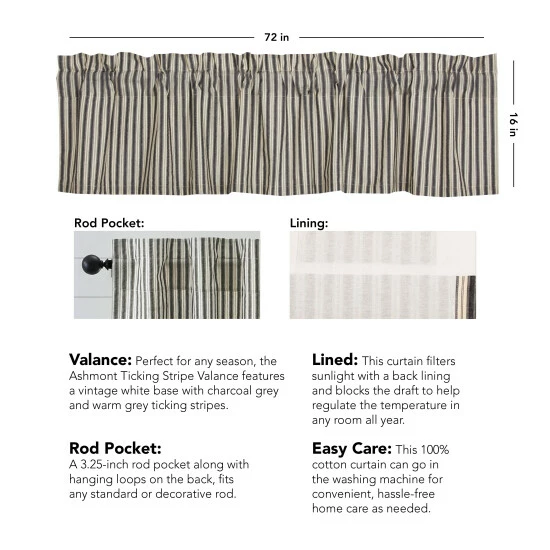 Classic and timeless, our Ashmont Ticking Stripe Valance 16×72 helps bring your farmhouse-inspired vision to life. Perfect for any season, our 100% cotton curtain features a vintage white base with charcoal grey and warm grey ticking stripes. This refreshing window treatment coordinates effortlessly with our Ashmont bedding collection for a complete look in your country-style bedroom.