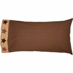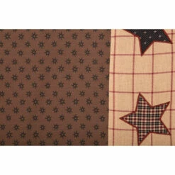 - 4″ trim of appliqued 5-point stars on tan and red windowpane plaid fabric at opening