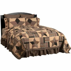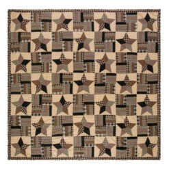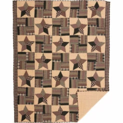 Bingham Star Quilt features colorful 5 point patchwork stars set on a windowpane check, separated by blocks of fabric strips, a technique passed down by generations of American quilt makers. Dominant colors of black and brown bronze are found in woven yarn dyed checks and vintage inspired ditsy prints.