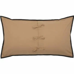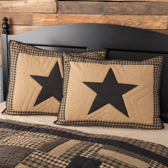 - 5-POINT STAR: This pillow sham contains a black star applique centered on solid tan cotton fabric, accented with black and tan check border