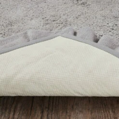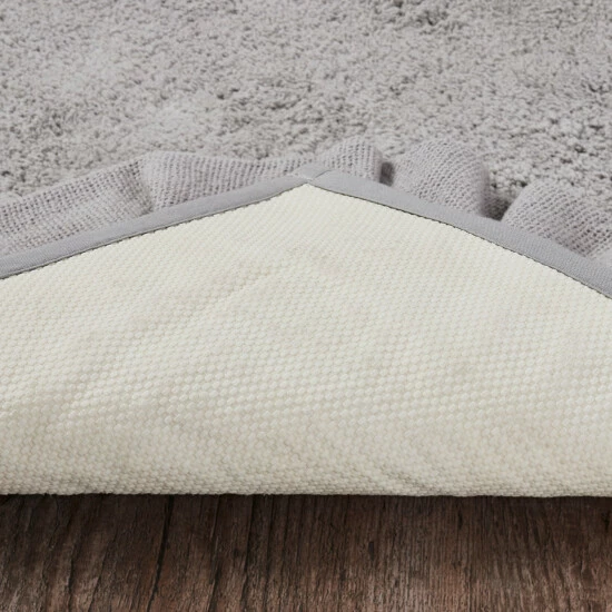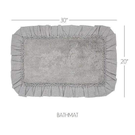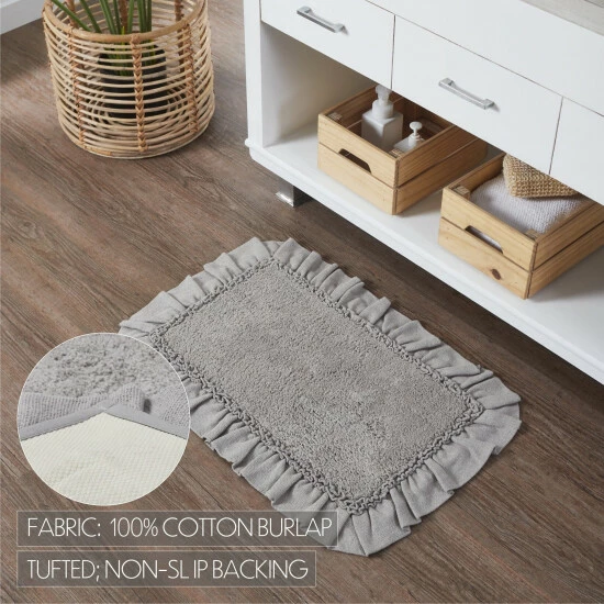 Add a country cottage flair to your bath or living space with the Burlap Dove Grey Bath Mat. This beautiful grey 20×30 comfortable mat adds farmhouse charm to your decor. With a ruffled edge, ruched ruffle, and tufted weave, this solidly colored bath mat will find a place in your home for years to come. Reverses to a solid tan rubber underside to prevent slippage.