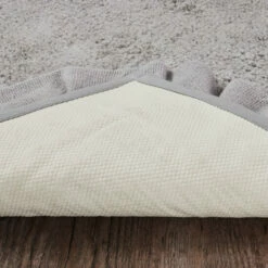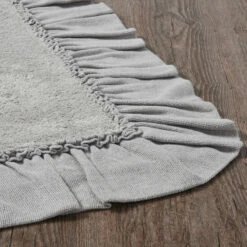 Add a country cottage flair to your bath or living space with the Burlap Dove Grey Bath Mat. This beautiful grey 27×48 comfortable mat adds farmhouse charm to your decor. With a ruffled edge, ruched ruffle, and tufted weave, this solidly colored bath mat will find a place in your home for years to come. Reverses to a solid tan rubber underside to prevent slippage.