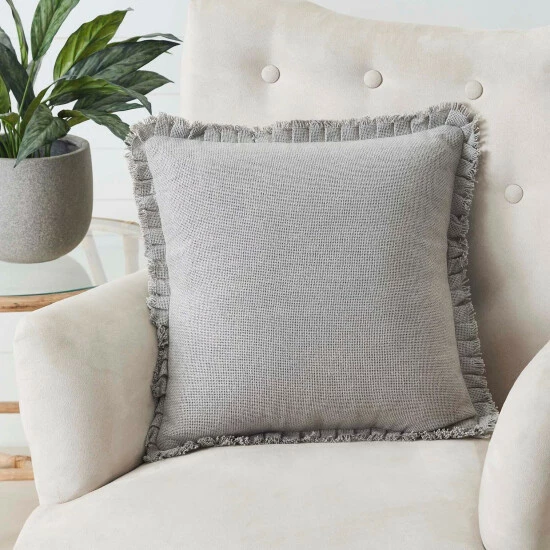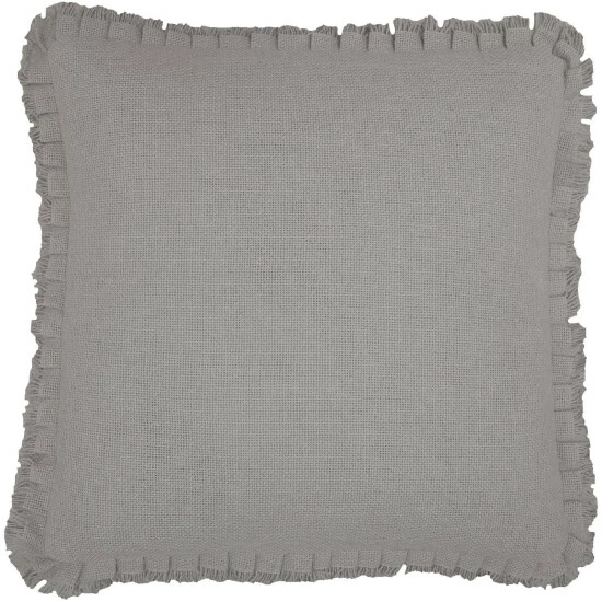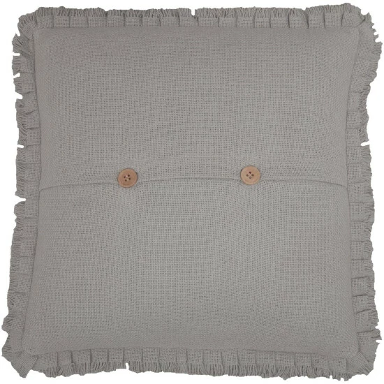 Add a neutral, elegant accent to your living room or bedroom with the Burlap Dove Grey Pillow with Fringed Ruffle. Made from our soft cotton burlap, this 18×18 throw pillow has both a fringe and a ruffle that creates vintage interest to an already classy pillow. Place this accent pillow on a couch, bed, or chair anywhere in your home. The wooden buttons can be displayed at the front to create layered interest or use the solid side for cozy simplicity. Machine washable and iron safe.
