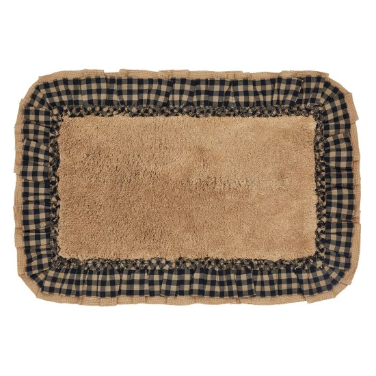 Add country flair to your bath or living space with the Burlap Natural Black Check Bath Mat. This comfortable 20×30 mat showcases beautiful concentric hues of natural tan and raven black. With a ruffled edge, ruched ruffle, and tufted weave, this check bath mat will find a place in your home for years to come. Reverses to a solid tan rubber underside to prevent slippage.