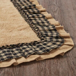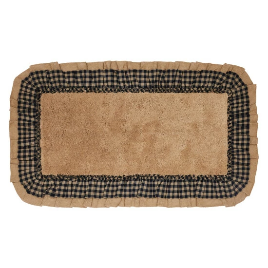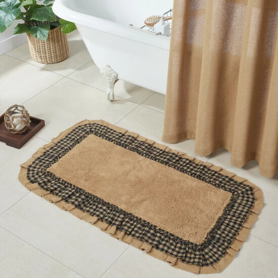 Add country flair to your bath or living space with the Burlap Natural Black Check Bath Mat. This comfortable 27×48 mat showcases beautiful concentric hues of natural tan and raven black. With a ruffled edge, ruched ruffle, and tufted weave, this check bath mat will find a place in your home for years to come. Reverses to a solid tan rubber underside to prevent slippage.