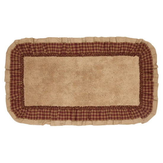 Add country flair to your bath or living space with the Burlap Natural Burgundy Check Bath Mat. This comfortable 27×48 mat showcases beautiful concentric hues of natural tan and burgundy. With a ruffled edge, ruched ruffle, and tufted weave, this check bath mat will find a place in your home for years to come. Reverses to a solid tan rubber underside to prevent slippage.