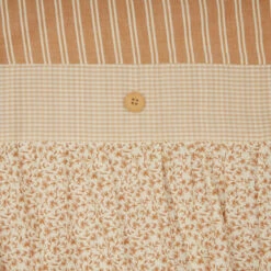 The Camilia Ruffle Shower Curtain 72×72 transforms your bath with a touch of cozy rustic romance. Classic stripes in gold and creme grace this decorative curtain along with a delicate ruffle towards the top, dressed in a vintage floral design. Finished with wooden buttons for added charm and dimension. Easily hang this country cottage bath curtain with shower hooks of your choosing (not included) using the button holes attached. A 3″ rod pocket is also available as an alternative hanging method.