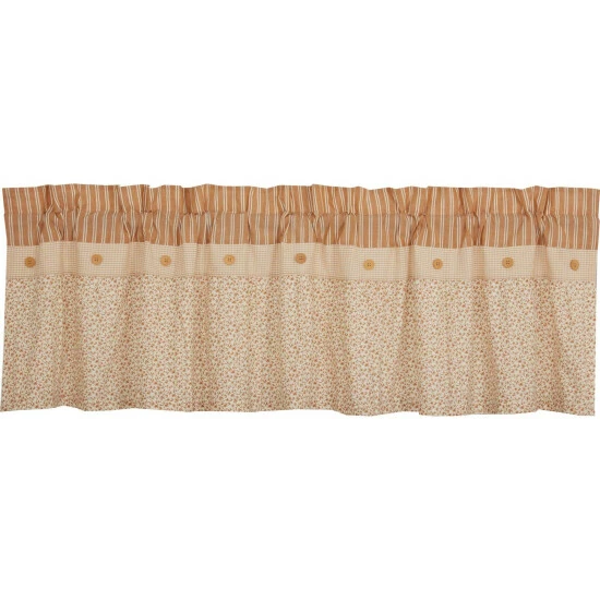 Bring the quaint vision of country life and simpler times to life with our Camilia Ruffled Valance 19×72. This gold and creme stripe curtain set is beautifully decorated with a graceful ruffle and wooden buttons adding rustic romance and heartwarming, cozy cottage vibes to your window.