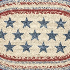 AMERICANA DECOR PLACEMAT: Our Celebration Jute 12×18 inch Oval Placemat features alternating solid and mixed braids in a patriotic color palette with stenciled blue stars in the center.,TEXTURED MATERIAL: The single placemat is crafted with 80 percent jute and 20 percent other fibers; the tighter weave allows it to lay flatter once the item is unpackaged.,PROTECTS SURFACES: Unique fiber and braiding protect surfaces from heat, scratches, and condensation.,EASY TO CLEAN: To give your jute placemat as many years of quality comfort as possible, carefully spot clean when dirty.,COORDINATING ACCESSORIES: Pair this Americana placemat with matching runners, coasters, and more from the Celebration collection.