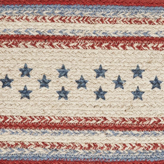 AMERICANA RUNNER: Our Celebration Jute 8×24 inch Oval Runner features alternating solid and mixed braids in a patriotic color palette with stenciled blue stars in the center.,TEXTURED MATERIAL: The single runner is crafted with 80 percent jute and 20 percent other fibers; the tighter weave allows it to lay flatter once the item is unpackaged.,PROTECTS SURFACES: Unique fiber and braiding protect surfaces from heat, scratches, and condensation.,EASY TO CLEAN: To give your jute runner as many years of quality comfort as possible, carefully spot clean when dirty.,COORDINATING ACCESSORIES: Pair this Americana runner with matching other matching tabletop and rugs from the Celebration collection.