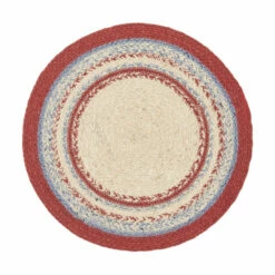 AMERICANA TRIVET: Our Celebration Jute 15 inch Trivet features alternating solid and mixed braids in a patriotic color palette with stenciled blue stars in the center.,TEXTURED MATERIAL: The single trivet is crafted with 80 percent jute and 20 percent other fibers, adding both style and function to your country decor.,PROTECTS SURFACES: Unique fiber and braiding protect surfaces from heat, scratches, and condensation.,EASY TO CLEAN: To give your jute trivet as many years of quality comfort as possible, carefully spot clean when dirty.,COORDINATING ACCESSORIES: Pair this Americana trivet with matching other matching tabletop and rugs from the Celebration collection.