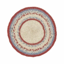 AMERICANA TRIVET: Our Celebration Jute 8 inch Trivet features alternating solid and mixed braids in a patriotic color palette with stenciled blue stars in the center.,TEXTURED MATERIAL: The single trivet is crafted with 80 percent jute and 20 percent other fibers, adding both style and function to your country decor.,PROTECTS SURFACES: Unique fiber and braiding protect surfaces from heat, scratches, and condensation.,EASY TO CLEAN: To give your jute trivet as many years of quality comfort as possible, carefully spot clean when dirty.,COORDINATING ACCESSORIES: Pair this Americana trivet with matching other matching tabletop and rugs from the Celebration collection.