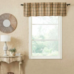 PREMIUM CONSTRUCTION: Our valences are crafted from the finest 100% cotton material, allowing them to last for years to come. Features a 3.25-inch rod pocket for easy lining and soft white cotton lining.,PRIMITIVE DECOR: With over two decades of experience crafting goods for American homes, our items are built to last for years to come. This Plaid Valance fits perfectly in both modern primitive and classic country settings. Hang anywhere in your home for added style and cozy country charm.,LIGHT FILTERING: Unlined with a closely woven appearance, this Plaid Valance gently lets in light while providing a little extra privacy. Place in your living room or bedroom to open up and brighten your space.,COORDINATES: Pair this primitive curtain with our many matching accessories, tabletop items, and rugs from the Cider Mill collection.,SIZE: Neutral russet brown, green, and khaki hues give this swag a modern primitive feel while keeping to a country design. The generous size of 16×60 inches is tailored to fit in almost any traditional window of your home.