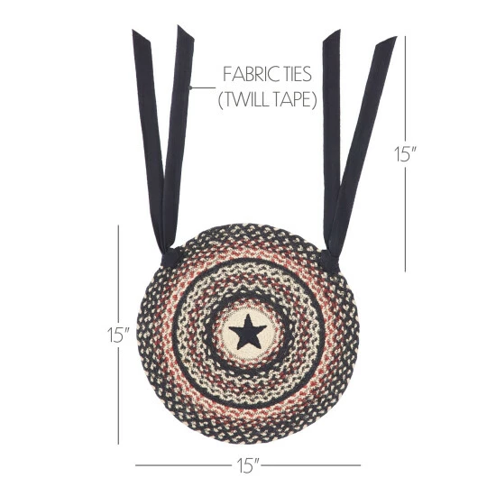 With the Colonial Star Jute Round Chair Pad, you’ll get the farmhouse feel without sacrificing comfort or durability. Our tightly woven jute braided chair cushions with ties are designed to relax and lay flat unlike 100% jute cushions. We tightly weave together natural, country black, and bright red braids surrounding a prominent Colonial Star applique for a long-lasting chair cover. Now you can have that braided, burlap design right in your kitchen! For a complete look, pair with our Colonial Star Jute Placemats and Table Runners.