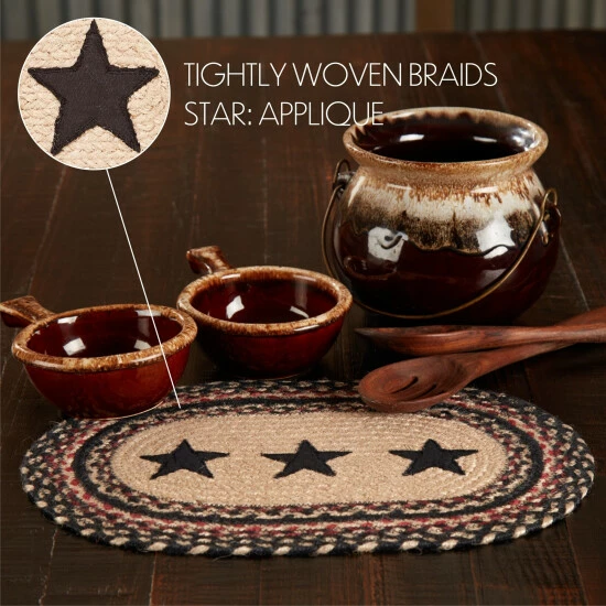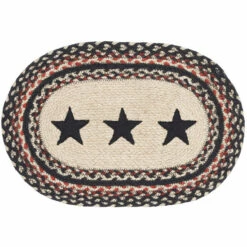 Add that cozy, farmhouse feel to your tabletop with our Colonial Star Jute Oval Placemat. This 10×15 inch rustic table placemat is the perfect feature for your kitchen or dining room table. The homemade feel comes to life with the woven braided jute wool blend fabrics in natural, country black, and bright red displayed in concentric ovals and features a Colonial Star applique motif. It’s perfect for any time of the year and can also be used as the foundation for a magical display in any room where you want that rustic farmhouse feel. It pairs perfectly with the Colonial Star Jute Coasters, Trivets, Chair Pads, and Runners..