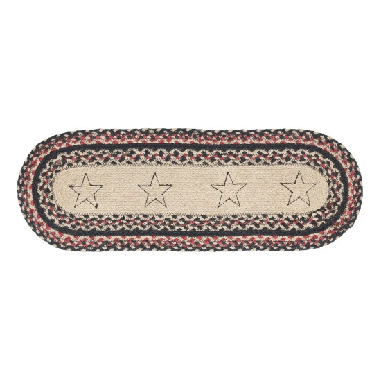 PRIMITIVE RUNNER: Our Colonial Star Jute 8×24 inch runner features alternating solid and mixed braids and black appliqued stars in a patriotic color palette.,TEXTURED MATERIAL: The single runner is crafted with 80 percent jute and 20 percent other fibers; the tighter weave allows it to lay flatter once the item is unpackaged.,PROTECTS SURFACES: Unique fiber and braiding protects surfaces from heat, scratches, and condensation.,EASY CARE: Due to its handmade nature, carefully spot clean with warm water as needed.,COORDINATING ACCESSORIES: Pair this primitive runner with matching placemats, coasters, and more from the Colonial Star Jute collection.