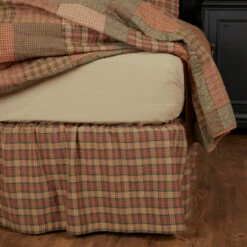 - Tan, blue, red, and green plaid gathered ruffle with 16″ drop