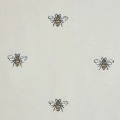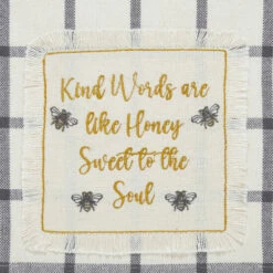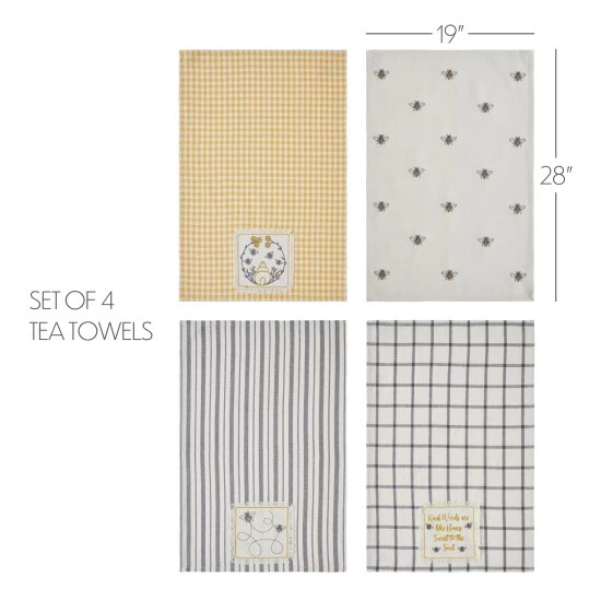 The Embroidered Bee Kitchen Tea Towel Set of 4 features a textured woven cotton base fabric with bee-inspired appliques and embroidery in natural creme, soft yellow, and charcoal grey. For your convenience, each towel includes a fabric loop for easy hanging.