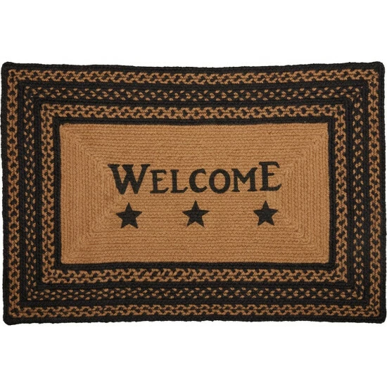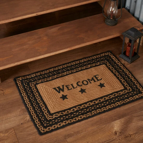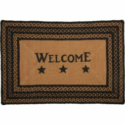 The 20″x30″ Farmhouse Welcome Jute Rug is ready for your home, retreat, or cabin with its durable and beautiful construction. Featuring alternating braids in black and dark tan with ‘Welcome’ stenciled over 5-point stars for years of enjoyment. Includes a separate 100% PVC rug pad that works on most floor types for non-slip quality.