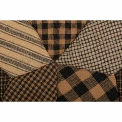 - Front features a patchwork 5-point star on black, tan, and dark creme ground with checker board trim