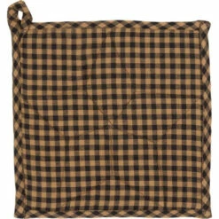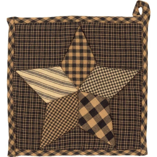 The Farmhouse Star Pot Holder features a black and tan plaid base fabric with a centered patchwork 5 point star. The primitive is made of black, tan and dark creme for a striking effect. Reverses to black and tan check.