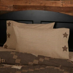 Stage your bed in a classic country look with the Standard Size Farmhouse Star Pillow Case w/Applique Star Set. Each set includes two pillow cases in a ticking stripe for a relaxed country look. This curtain features large 5 point stars in multi colored check patches of various-sized checks and plaid. A base fabric of ticking stripe adds laid back classic country appeal. This valance is perfect for Americana or colonial themed kitchens with neutral or dark colors. 100% cotton. Features a rod pocket for easy set up.