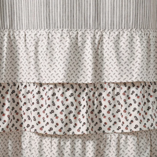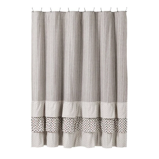 PREMIUM CONSTRUCTION: Our high-quality pieces are built to last for years to come. Our 100% cotton traditional striped shower curtain is expertly machine-stitched and carefully lined with soft cotton. This curtain features a ruffled edge, flat weave, and a 3-inch rod pocket for hanging. A plastic liner is recommended to keep your farmhouse shower curtain free from water stains.,FARMHOUSE DECOR: With over two decades of experience crafting goods for American homes, our items are built to last for years to come. Features a traditional style that compliments any farmhouse or French country home.,COORDINATING ACCESSORIES: Pair this farmhouse shower curtain with matching bed skirts, shams, pillows, panels, and valances from the Florette collection.,EASY CARE: To give your cotton shower curtain as many years of quality comfort as possible, place it in the wash on a gentle cycle, and afterward tumble dry low. If you want to capture the true essence of farmhouse living, let this french country-style shower accessory hang dry on a line. The 100% cotton fabric is safe to iron for your convenience.,SIZE: Neutral white, coffee brown, and red hues give this shower curtain a modern farmhouse feeling while keeping a country design. The generous size of 72×72 inches is tailored to fit with any traditional shower in your home.