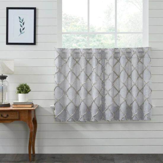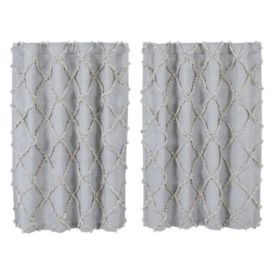 Create warmth in your living space with the Frayed Lattice Creme & Black Tier Set of 2 that has a farmhouse flair and a cozy design. This set of 2 tiers feature denim grey, soft black, and creme hues with a straight edge textured tufted weave. Our L36xW36 tiers are finished with convenient hanging loops that add country-style appeal to your kitchen or living room.