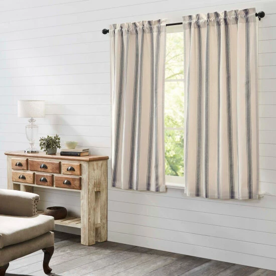 Functional and stylish, our Grace Grain Sack Stripe Panel Set 63×36 helps bring your farmhouse-inspired vision to life. Perfect for any season, these 100% cotton curtains feature a creme base with nickel grey grain sack stripes. This refreshing window treatment coordinates effortlessly with our Grace bedding collection for a complete look in your country-style bedroom. Give your curtains a simple refresh and let in natural light with our matching cloth tie-backs included.