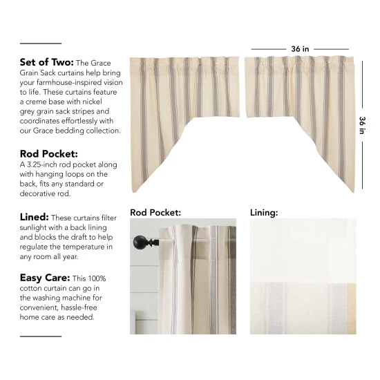 Functional and stylish, our Grace Grain Sack Stripe Swag Set 36x36x16 helps bring your farmhouse-inspired vision to life. Perfect for any season, these 100% cotton curtains feature a creme base with nickel grey grain sack stripes. This refreshing window treatment coordinates effortlessly with our Grace bedding collection for a complete look in your country-style bedroom.