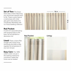 Functional and stylish, our Grace Grain Sack Tier Set 24″x36″ helps bring your farmhouse-inspired vision to life. Perfect for any season, these 100% cotton curtains feature a creme base with nickel grey grain sack stripes. This refreshing window treatment coordinates effortlessly with our Grace bedding collection for a complete look in your country-style bedroom.