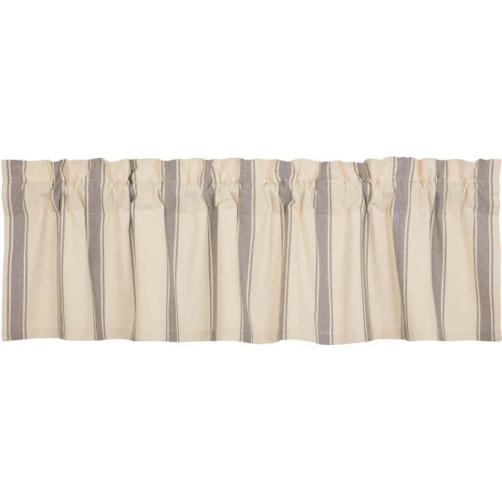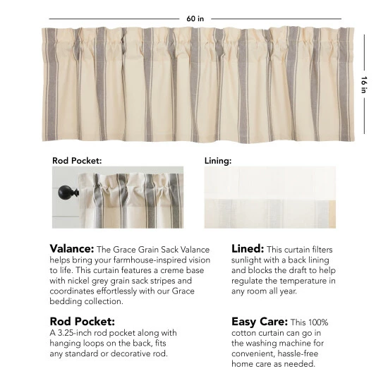 Functional and stylish, our Grace Grain Sack Valance 16″x60″ helps bring your farmhouse-inspired vision to life. Perfect for any season, this 100% cotton curtain features a creme base with nickel grey grain sack stripes. This refreshing window treatment coordinates effortlessly with our Grace bedding collection for a complete look in your country-style bedroom.