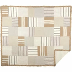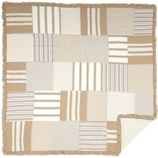 FARMHOUSE PATCHWORK: The front of this farmhouse quilt displays a genuine patchwork layout bringing a hand-crafted feel to the home with details such as hand stitching, a ruffled edge, and grain sack stripes adding a charming homespun touch to your bedroom.