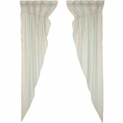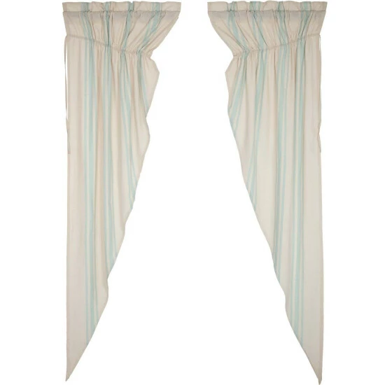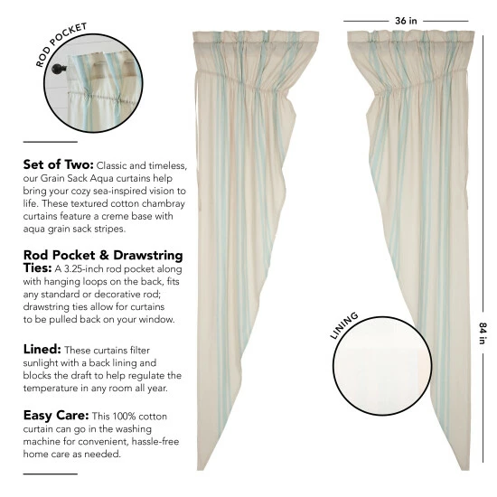 Classic and timeless, our Grain Sack Aqua Prairie Long Panel Set 84x36x18 helps bring your cozy sea-inspired vision to life. Perfect for any season, these textured cotton chambray curtains feature a creme base with aqua grain sack stripes. This refreshing window treatment coordinates well with our Avani Sea Glass bedding collection for a complete look in your vintage or boho farmhouse-style bedroom. Give your curtains a simple refresh and let in natural light with the drawstring ties attached.
