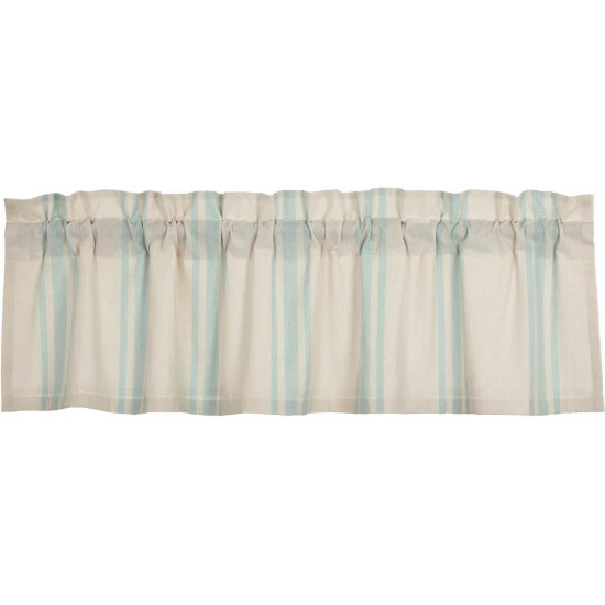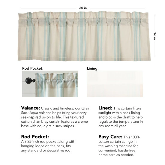 Classic and timeless, our Grain Sack Aqua Valance 16×60 helps bring your cozy sea-inspired vision to life. Perfect for any season, this textured cotton chambray curtain features a creme base with aqua grain sack stripes. This refreshing window treatment coordinates well with our Avani Sea Glass bedding collection for a complete look in your vintage or boho farmhouse-style bedroom. Give your curtains a simple refresh and let in natural light with the drawstring ties attached.