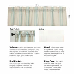 Classic and timeless, our Grain Sack Aqua Valance 16×72 helps bring your cozy sea-inspired vision to life. Perfect for any season, this textured cotton chambray curtain features a creme base with aqua grain sack stripes. This refreshing window treatment coordinates well with our Avani Sea Glass bedding collection for a complete look in your vintage or boho farmhouse-style bedroom. Give your curtains a simple refresh and let in natural light with the drawstring ties attached.