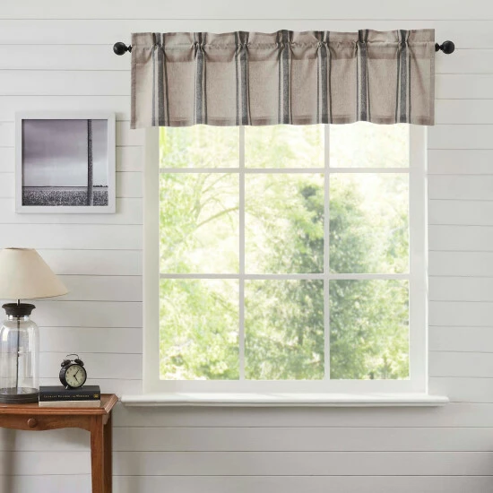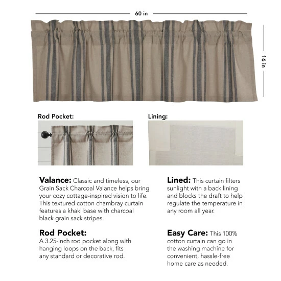 Classic and timeless, our Grain Sack Charcoal Valance 16×60 helps bring your cozy cottage-inspired vision to life. Perfect for any season, this textured cotton chambray curtain features a khaki base with charcoal black grain sack stripes. This refreshing window treatment coordinates effortlessly with our Sawyer Mill Charcoal bedding collection for a complete look in your vintage-style bedroom.